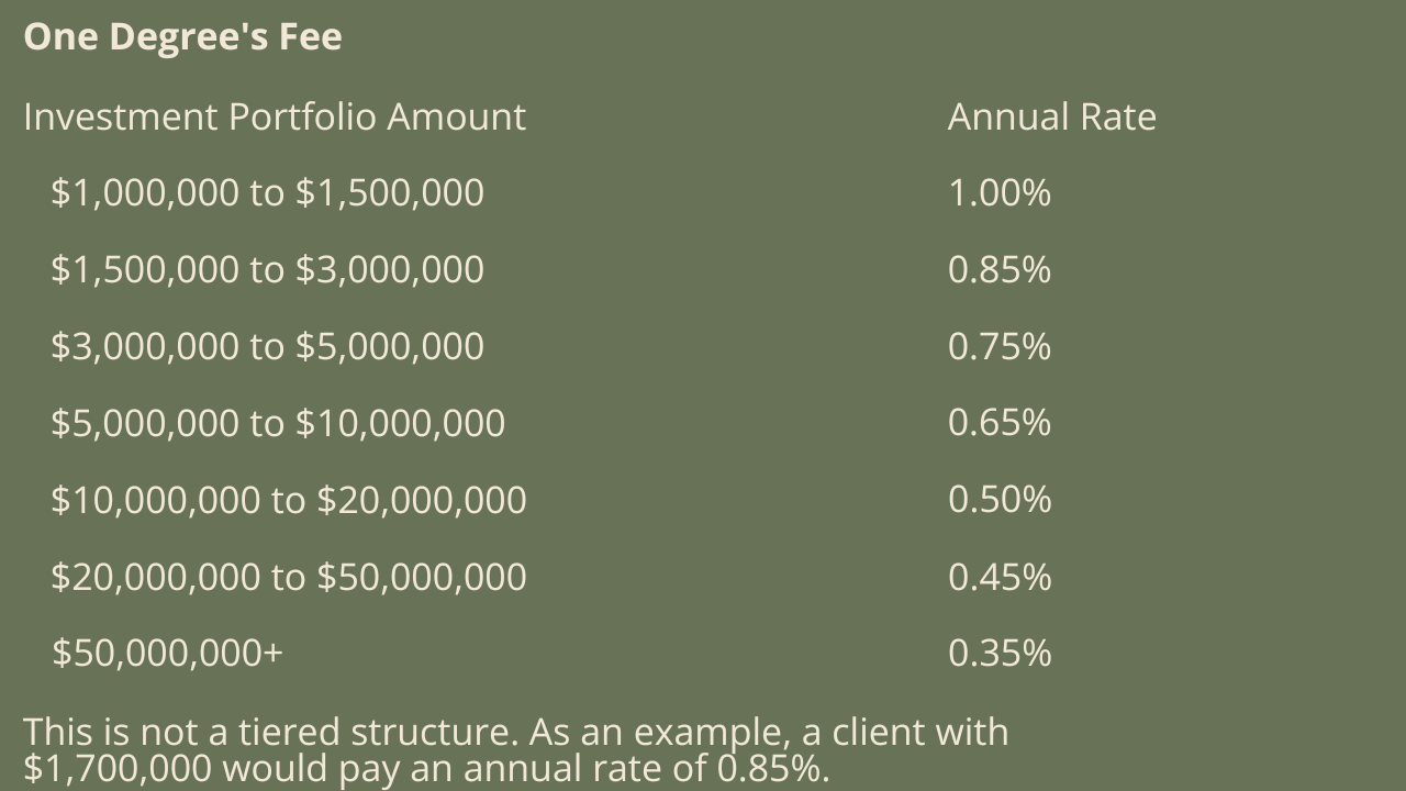 We charge a transparent, flat percentage based on the assets we actively manage. There are no hidden fees, no commissions, and no extra charges for tax or estate planning—just straightforward pricing that aligns our success with yours.